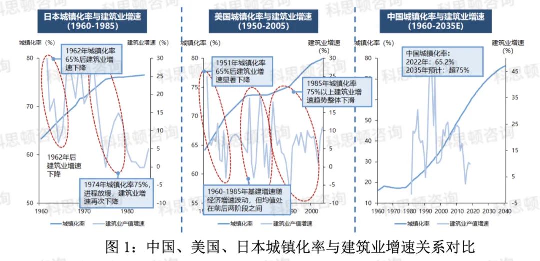 2022年中国城镇化率为65.2%。对比美国、日本等国家的数据发现:当城镇化率达到65%后,城镇化进程会放缓,建筑业发展增速会下降;当城镇化率达到75%时,城镇化进入了顶峰,难以再发展,建筑业增速再会下降,发展进入了瓶颈期。根据专家估计,中国城镇化率在2035年达到75%,差不多需要13年的时间,也就是说建筑业还有13年的发展机遇期。