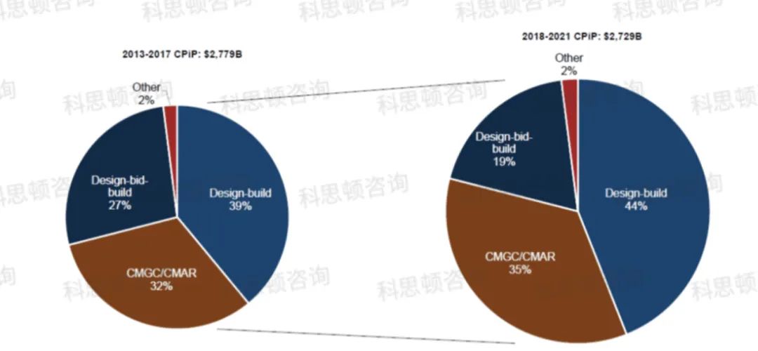 美国工程总承包模式占比逐年提升。到2021年,以DBB模式发包的工程占比从2013年27%下降到19%;以DB模式发包的项目从39%上升到44%;以CMCC/CMAR模式发包的项目占比从32%上升到35%。