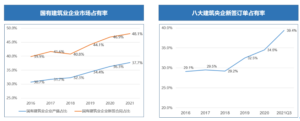 “十三五”以来,国有建筑企业的市场占有率逐年提升,截至2021年底,国有建筑企业的新签合同额占比已经达到48.1%,数量仅占建筑企业总数6.1%的国有建筑企业,市场份额却占据了建筑业的半壁江山!国有建筑企业的迅猛发展将大大挤占民营建筑企业的市场空间,使得民营企业的生存与发展更加艰难,企业间的竞争将呈现出白热化的状态。