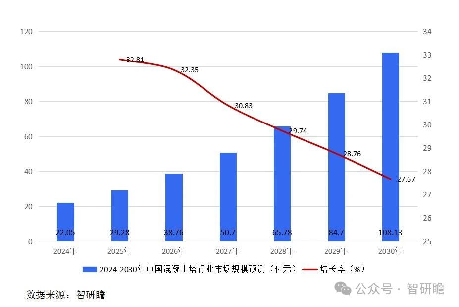 ? 据智研瞻预测,2024-2030年中国混凝土塔行业市场规模增长率在27%-33%,2030年中国混凝土塔行业市场规模108.13亿元,同比增长27.67%。2024-2030年中国混凝土塔行业市场规模预测如下: