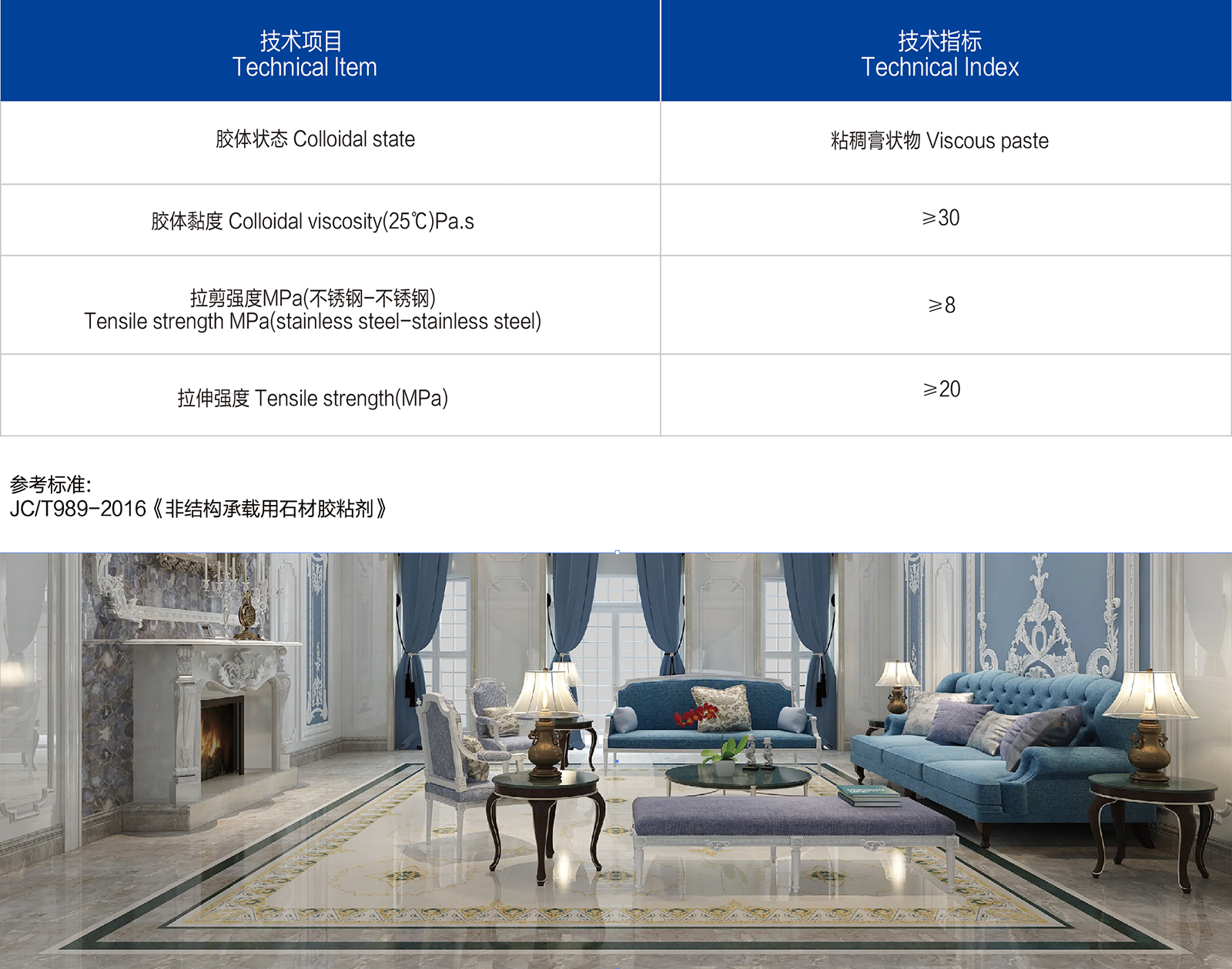 产品主要原材料为改性树脂,适用于石材的粘贴、快速定位、拼花等施工。