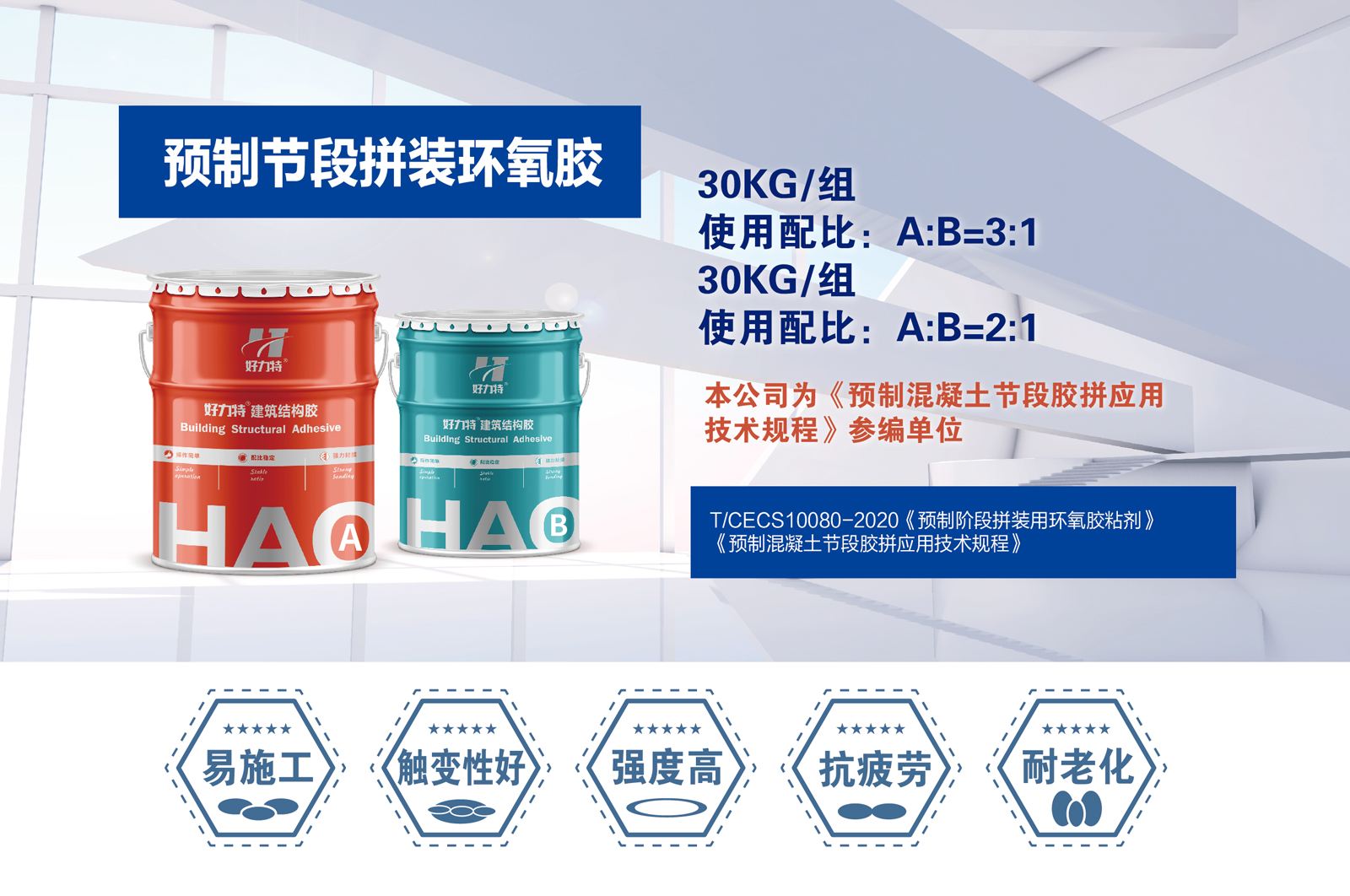 混凝土预制结构拼接胶(预制节段拼装环氧胶)主要原材料为高性能环氧树脂和改性胺、多种有机和无机材料复合而成。主要适用桥梁、涵洞、地下结构及风电塔筒的预制混凝土构件拼接施工。