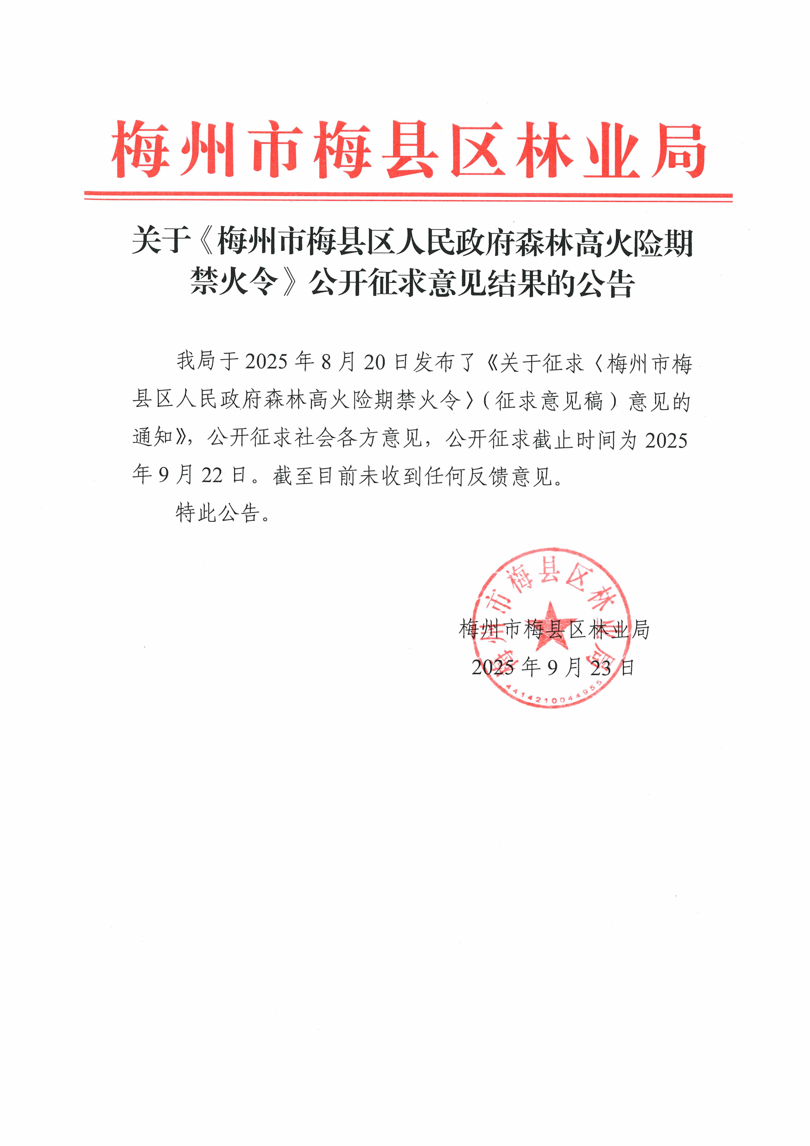 关于《梅州市梅县区人民政府森林高火险期禁火令》公开征求意见结果的公告
