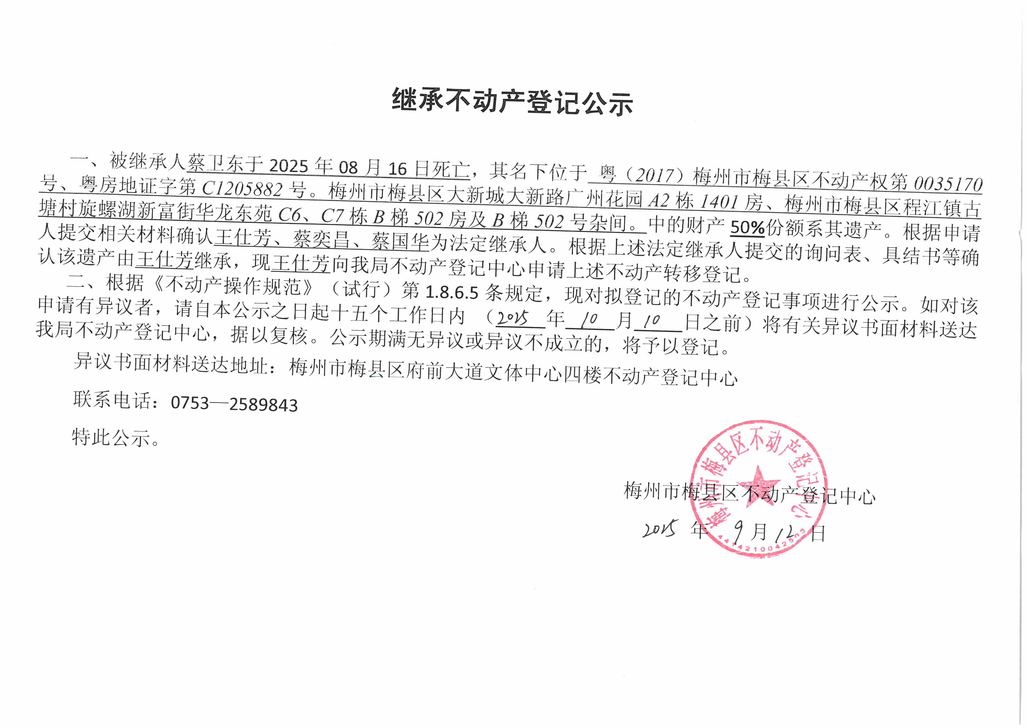 被继承人蔡卫东于2025年08月16日死亡,其名下位于粤(2017)梅州市梅县区不动产权第0035170号、粤房地证字第C1205882号。梅州市梅县区大新城大新路广州花园A2栋1401房、梅州市梅县区程江镇古塘村旋螺湖新富街华龙东苑C6、C7栋B梯502房及B梯502号杂间中的财产50%份额系其遗产。根据申请人提交相关材料确认王仕芳、蔡奕昌、蔡国华为法定继承人。根据上述法定继承人提交的询问表、具结书等确认该遗产由王仕芳继承,现王仕芳向我局不动产登记中心申请上述不动产转移登记。