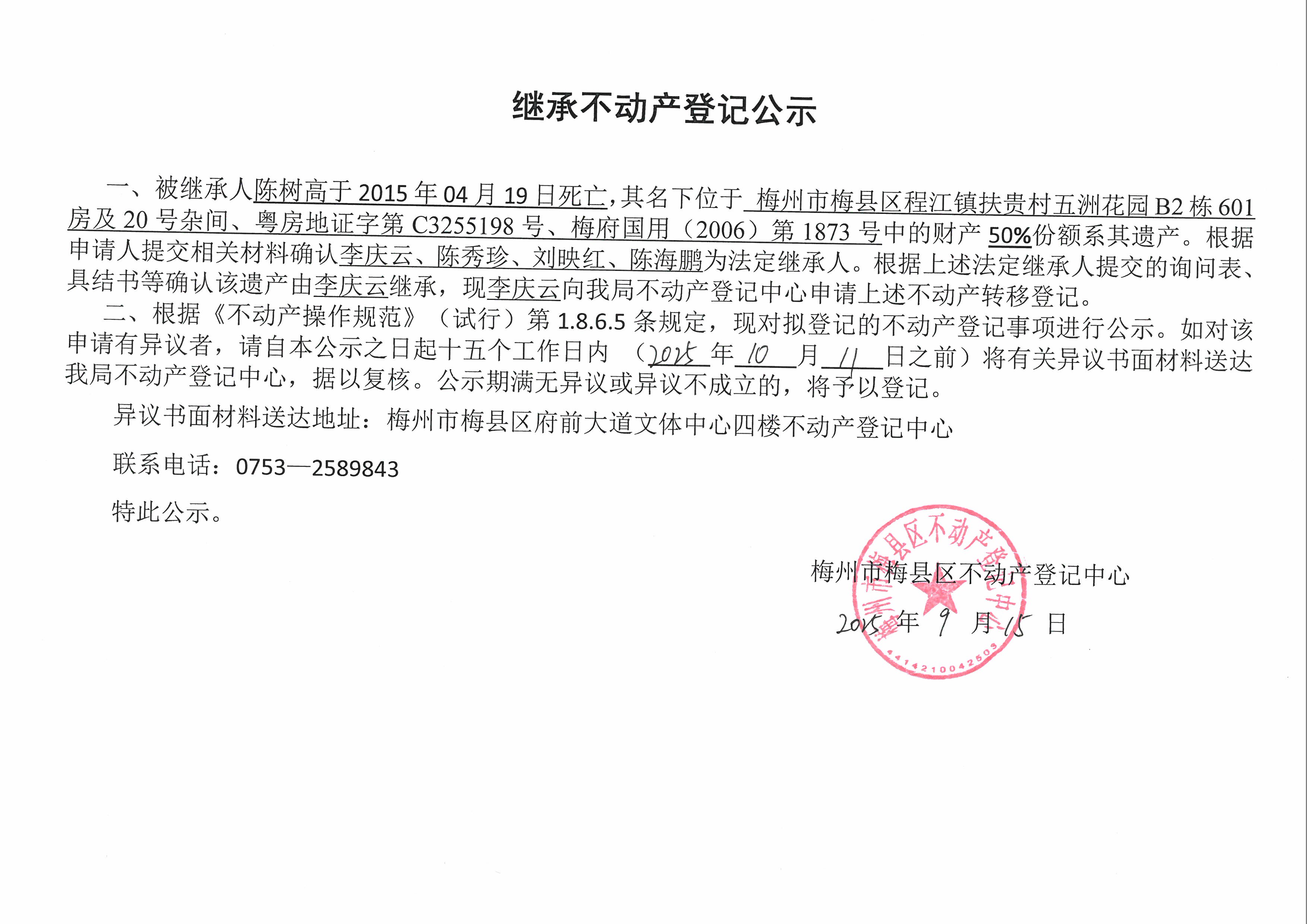 不动产登记中心登记公告(非公证继承-李庆云-粤房地证字第C3255198号、梅府国用(2006)第1873号)