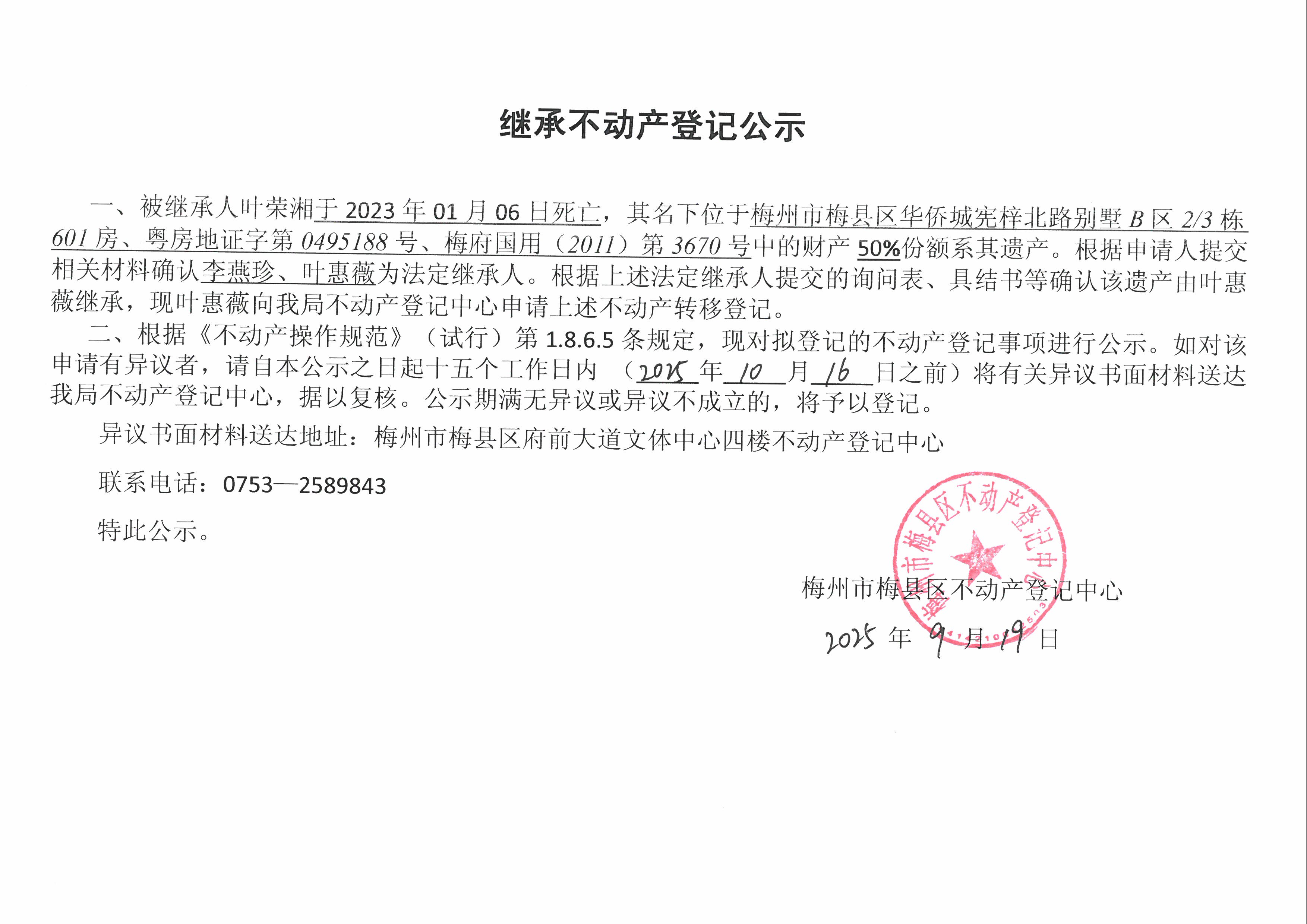 被继承人叶荣湘于2023年01月06日死亡,其名下位于梅州市梅县区华侨城宪梓北路别墅B区2/3栋601房、粤房地证字第0495188号、梅府国用(2011)第3670号中的财产50%份额系其遗产。根据申请人提交相关材料确认李燕珍、叶惠薇为法定继承人。根据上述法定继承人提交的询问表、具结书等确认该遗产由叶惠薇继承,现叶惠薇向我局不动产登记中心申请上述不动产转移登记。