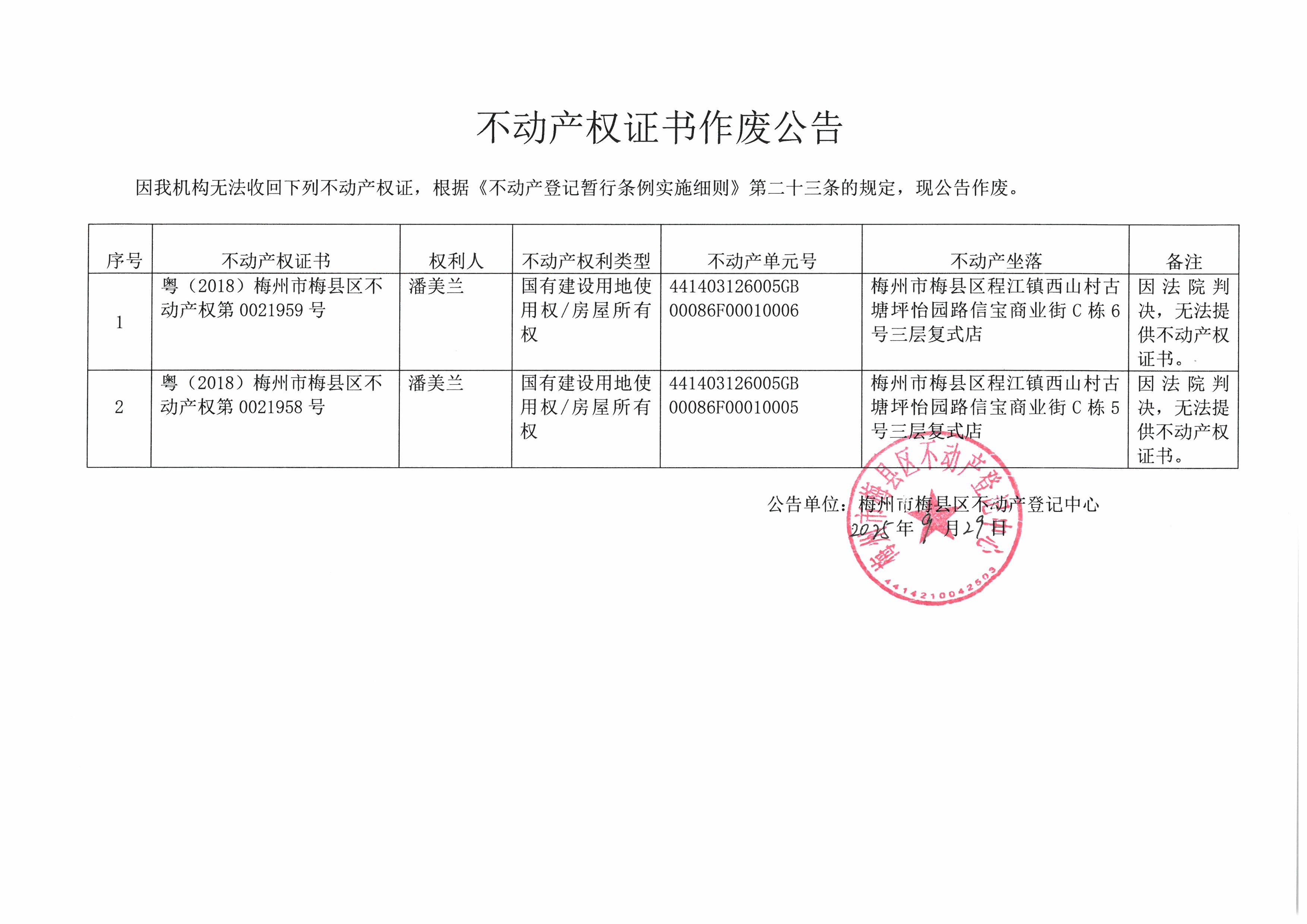 不动产登记中心登记公告(作废公告-潘美兰-粤(2018)梅州市梅县区不动产权第0021959号、粤(2018)梅州市梅县区不动产权第0021958号)
