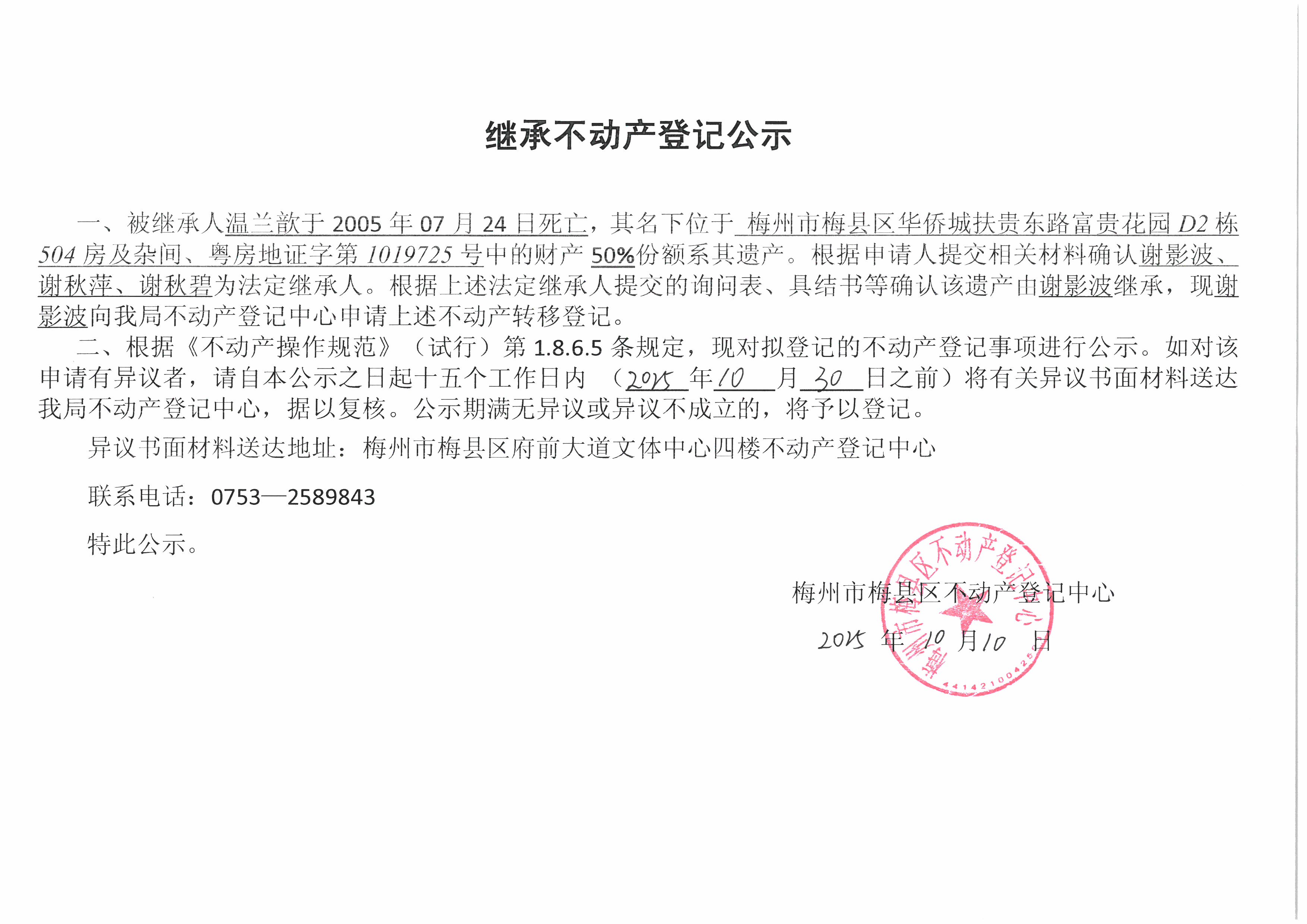 被继承人温兰歆于2005年07月24日死亡,其名下位于梅州市梅县区华侨城扶贵东路富贵花园D2栋504房及杂间、粤房地证字第1019725号中的财产50%份额系其遗产。根据中请人提交相关材料确认谢影波、谢秋萍、谢秋碧为法定继承人。根据上述法定继承人提交的询问表、具结书等确认该遗产由谢影波继承,现谢影波向我局不动产登记中心申请上述不动产转移登记。