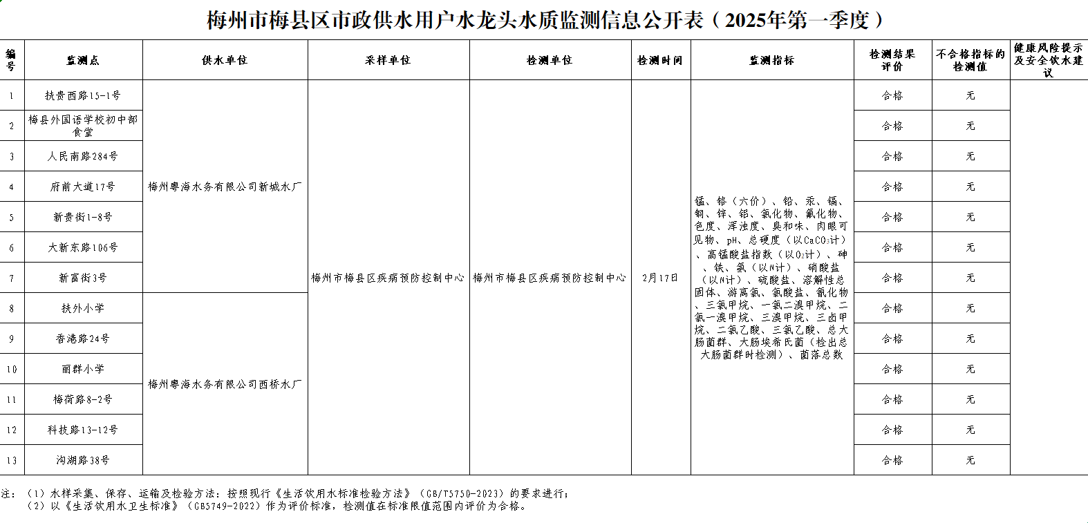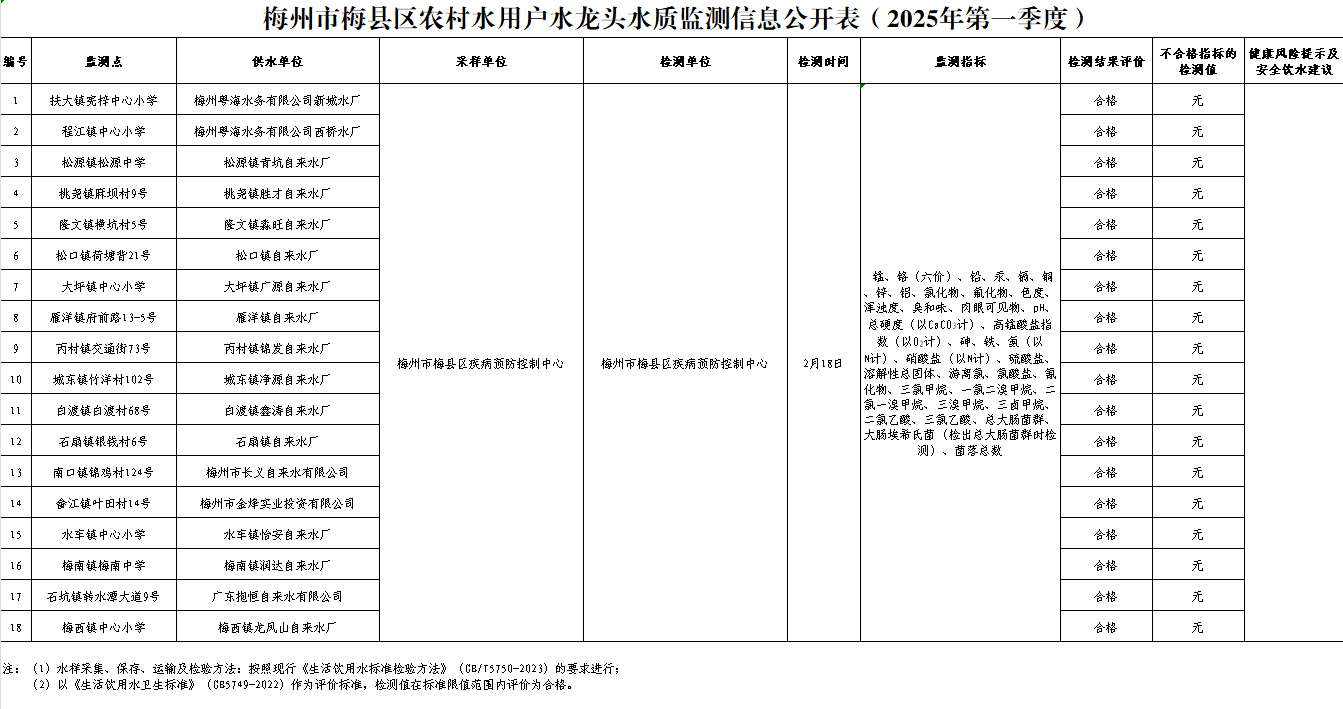 梅州市梅县区农村水用户和市政供水用户水龙头水质监测信息公开表(2025年第一季度)