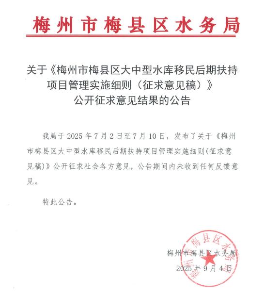 关于《梅州市梅县区大中型水库移民后期扶持项目管理实施细则(征求意见稿)》公开征求意见结果的公告