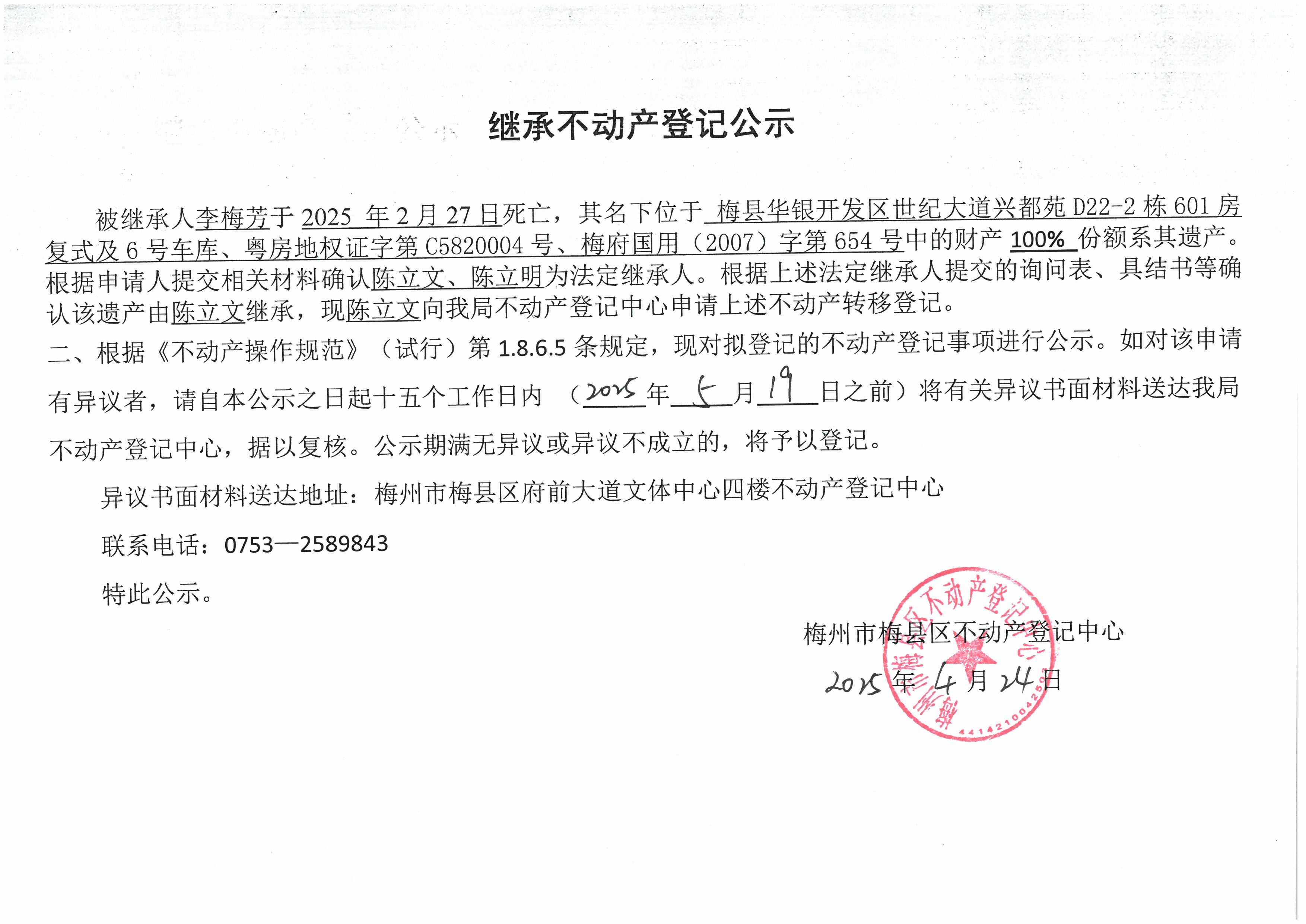 被继承人李梅芳于2025年2月27日死亡,其名下位于梅县华银开发区世纪大道兴都苑D22-2栋601房复式及6号车库、粤房地权证字第C5820004号、梅府国用(2007)字第654号中的财产100%份额系其遗产。根据申请人提交相关材料确认陈立文、陈立明为法定继承人。根据上述法定继承人提交的询问表、具结书等确认该遗产由陈立文继承,现陈立文向我局不动产登记中心申请上述不动产转移登记。