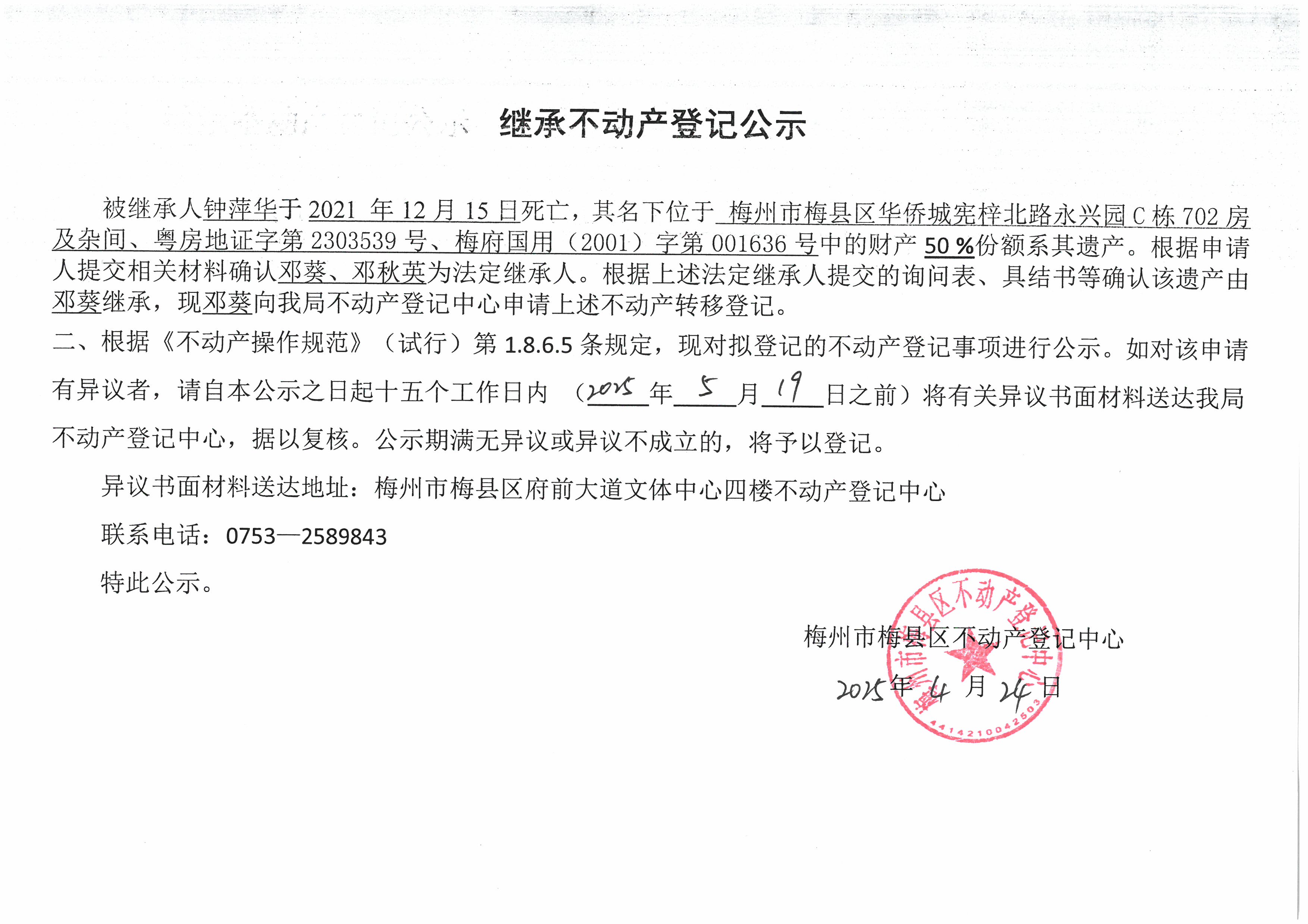 被继承人钟萍华于2021年12月15日死亡,其名下位于梅州市梅县区华侨城宪北路永兴园C栋702房及杂间、粤房地证字第2303539号、梅府国用(2001)字第001636号中的财产50%份额系其遗产。根据申请人提交相关材料确认邓葵、邓秋英为法定继承人。根据上述法定继承人提交的询问表、具结书等确认该遗产由邓葵继承,现邓葵向我局不动产登记中心申请上述不动产转移登记。