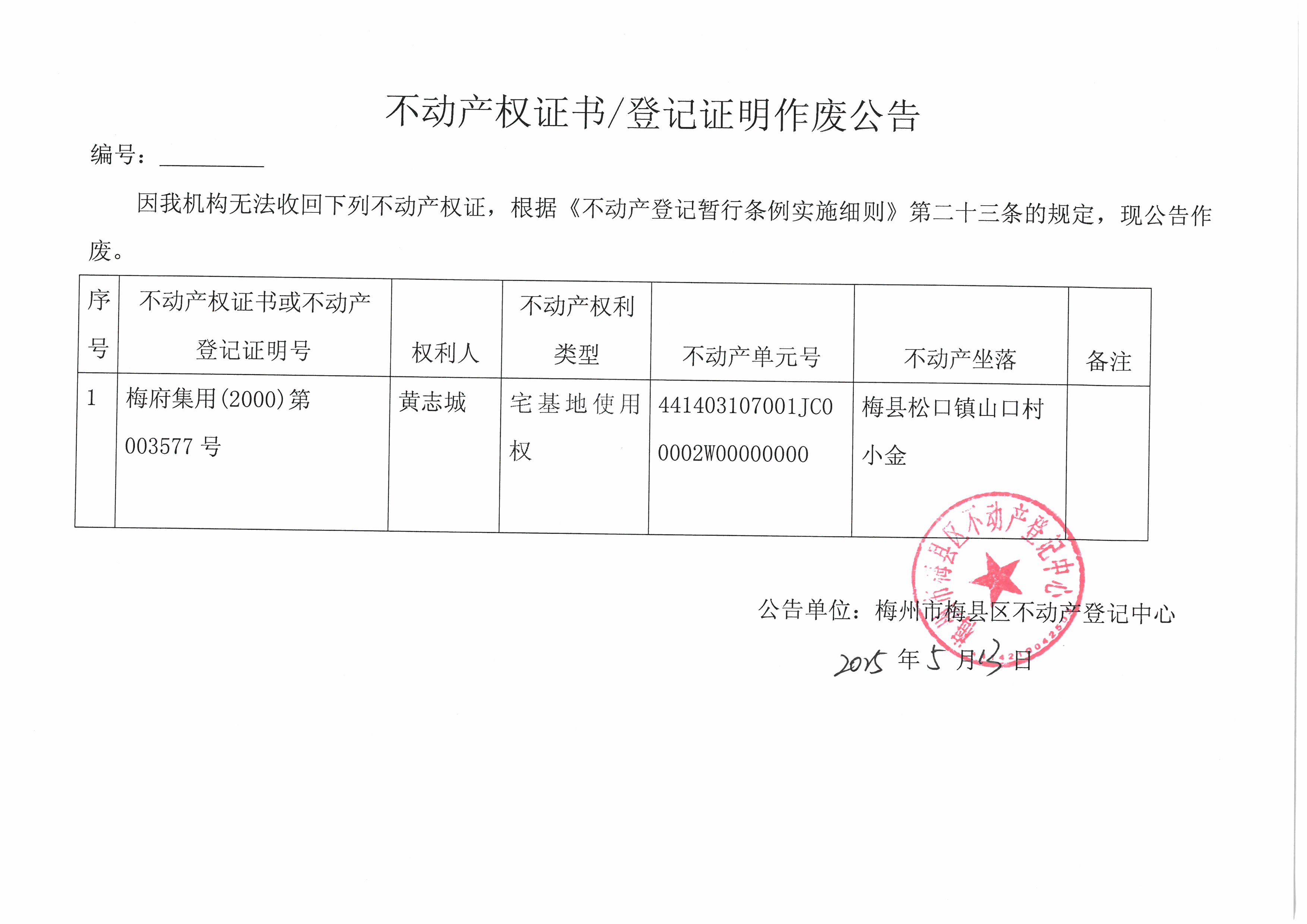 因我机构无法收回下列不动产权证,根据《不动产登记暂行条例实施细则》第二十三条的规定,现公告作废。