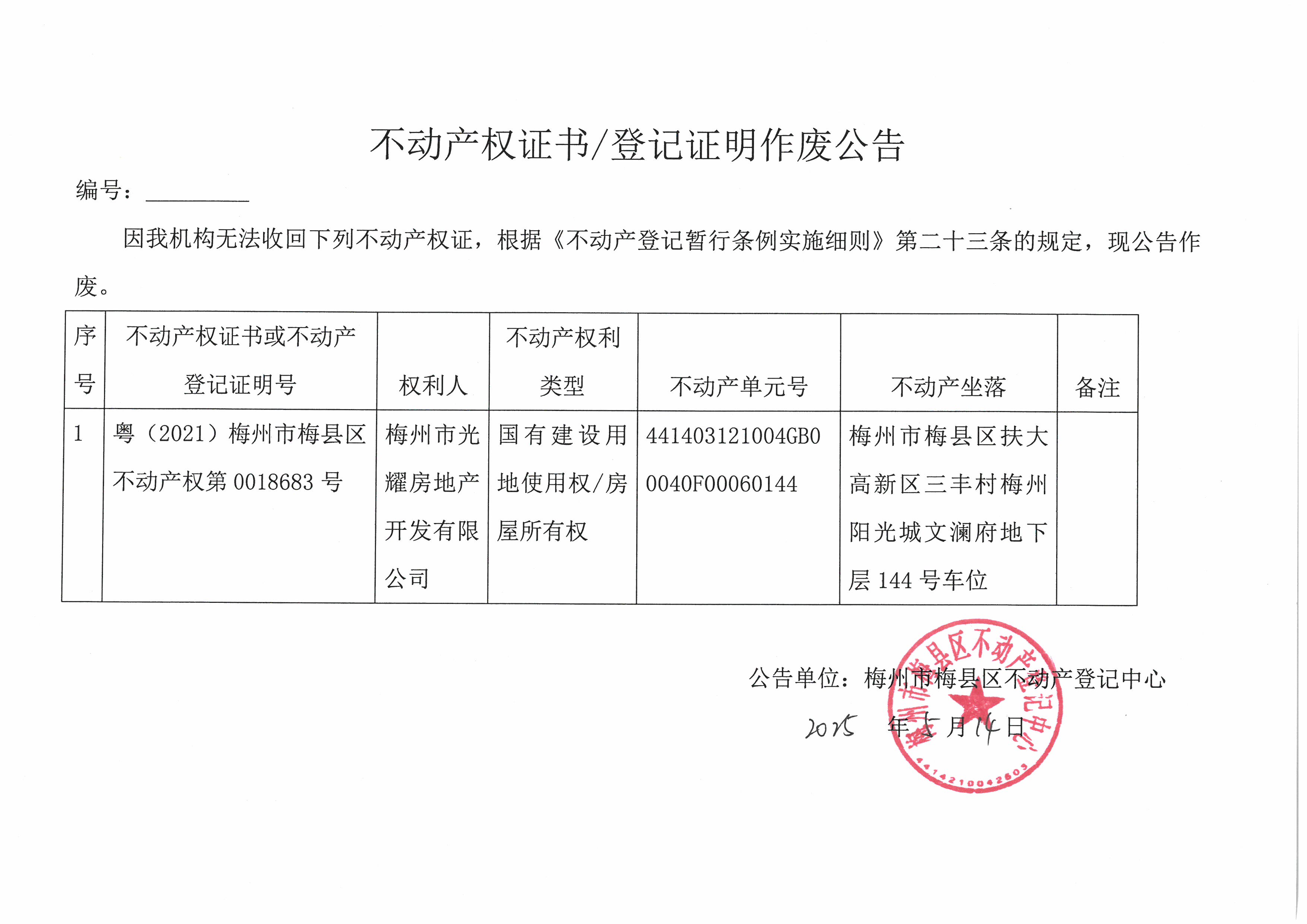 1  | 粤(2021)梅州市梅县区不动产权第0018683号  | 梅州市光耀房地产开发有限公司  | 国有建设用 地使用权/房 屋所有权  | 441403121004GB0 0040F00060144  | 梅州市梅县区扶大高新区三丰村梅州阳光城文澜府地下层144号车位  |