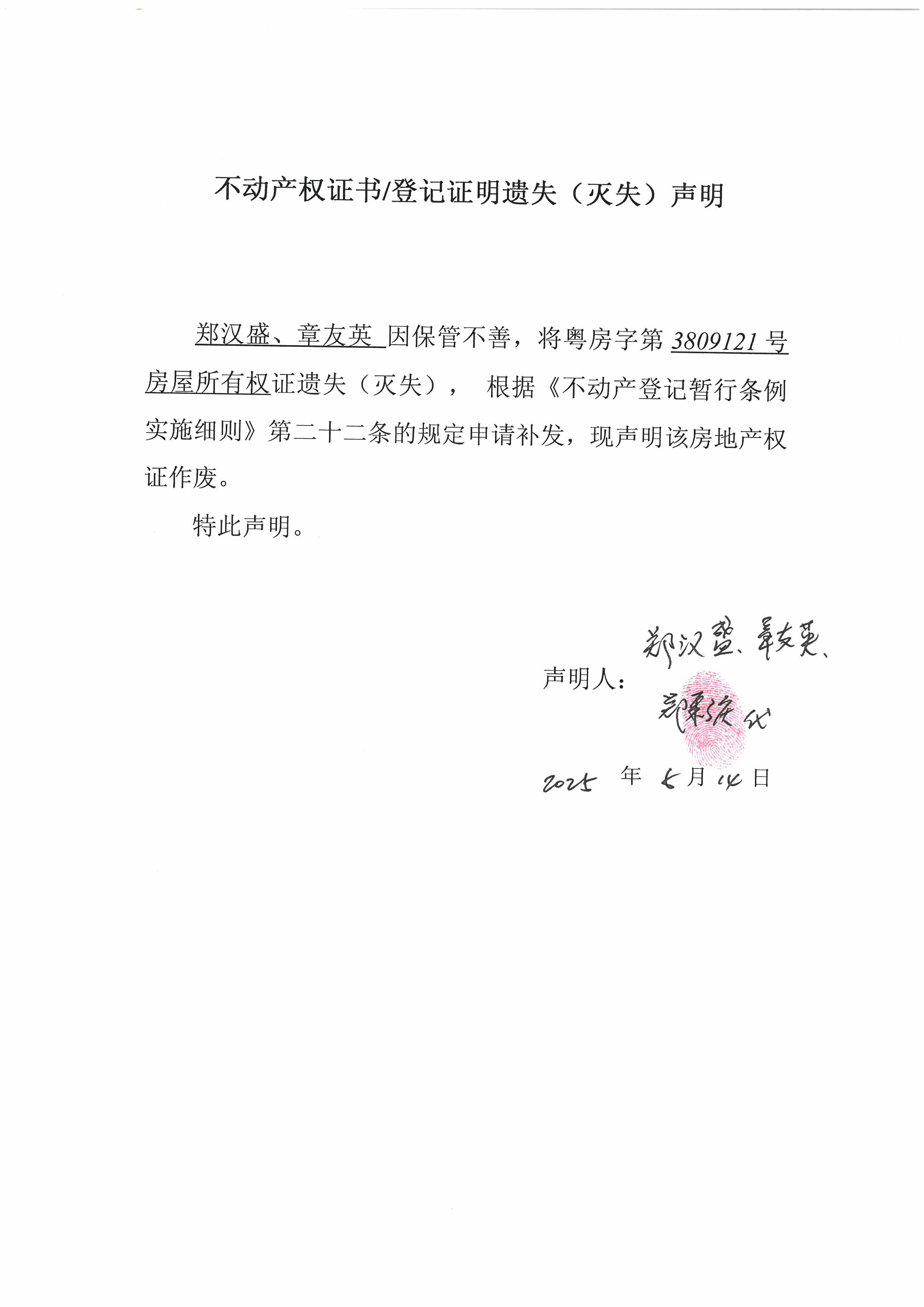 郑汉盛、章友英因保管不善,将粤房字第3809121号房屋所有权证遗失(灭失),根据《不动产登记暂行条例实施细则》第二十二条的规定申请补发,现声明该房地产权证作废。