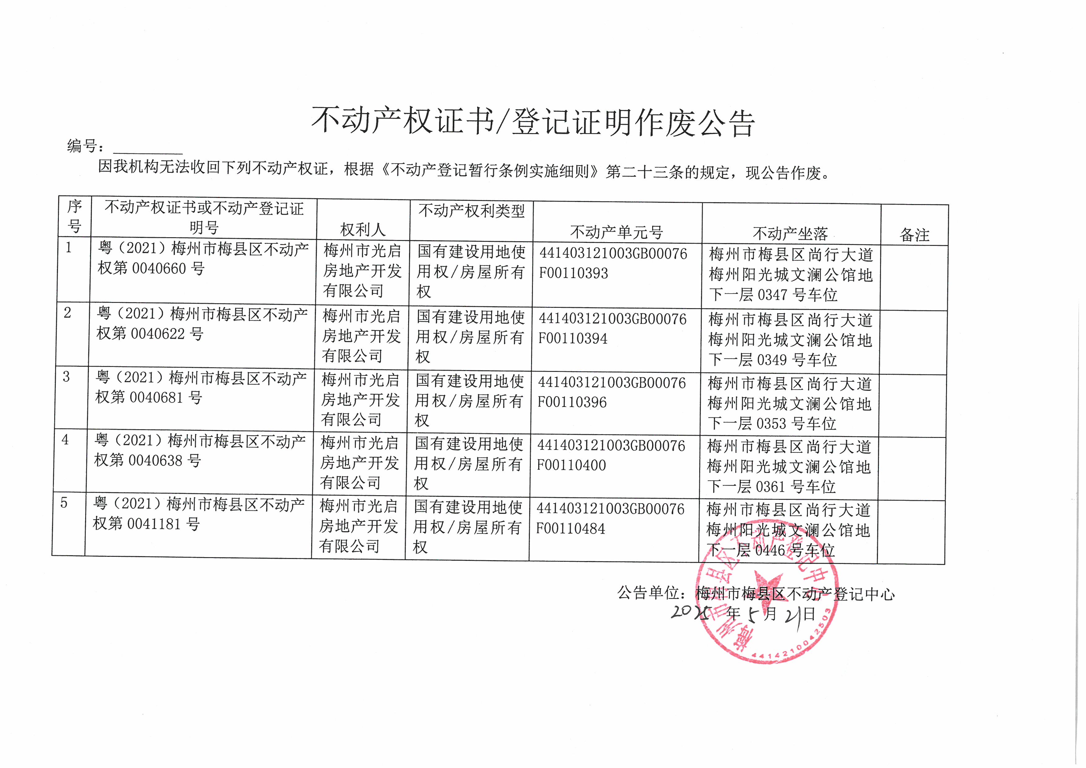 5  | 粤(2021)梅州市梅县区不动产权第0041181号  | 梅州市光启房地产开发有限公司  | 国有建设用地使用权/房屋所有权  | 441403121003GB00076F00110484  | 梅州市梅县区尚行大道梅州阳光城文澜公馆地下一层0446号车位  | |