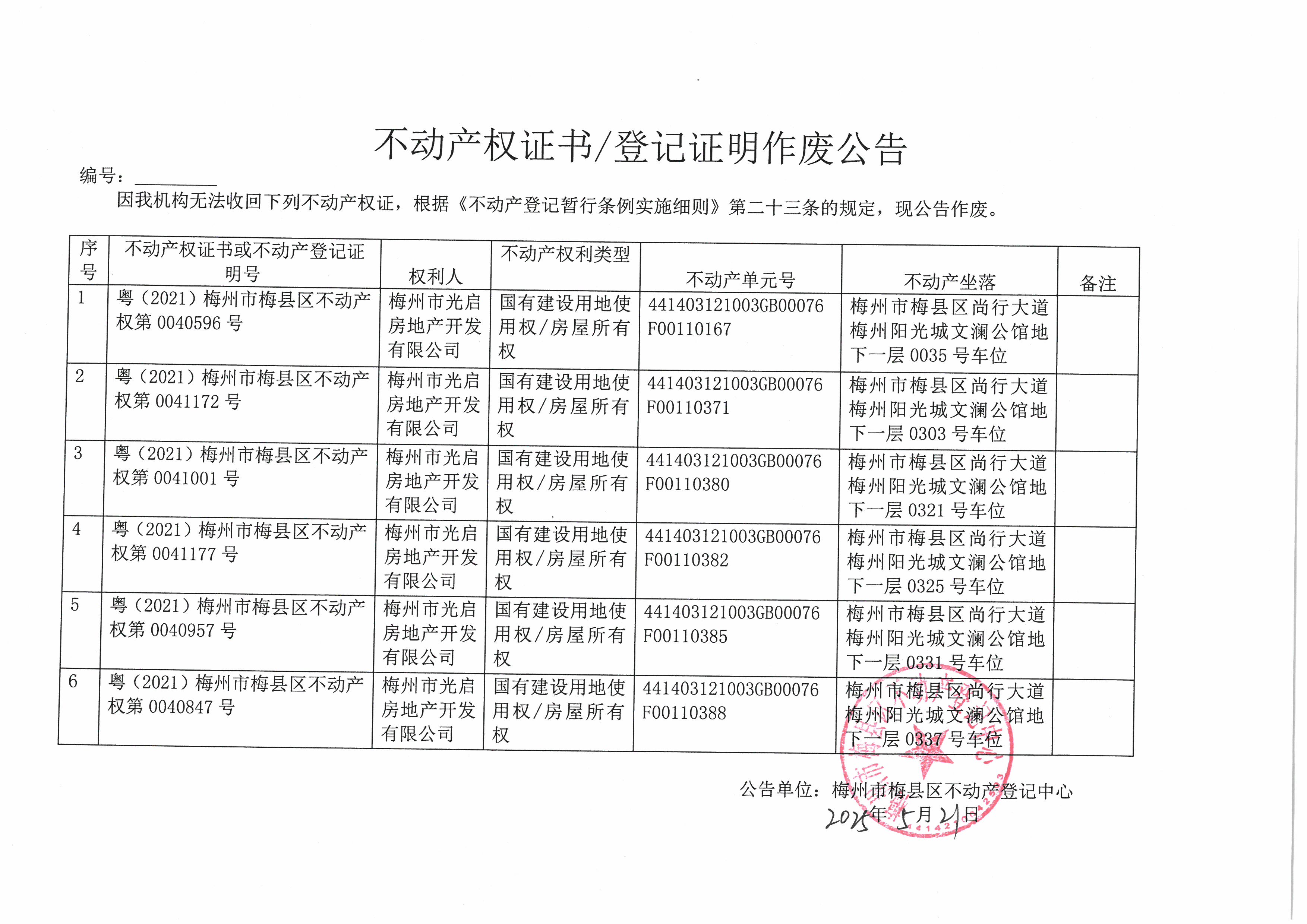 7  | 粤(2021)梅州市梅县区不动产权第0041172号  | 梅州市光启房地产开发有限公司  | 国有建设用地使用权/房屋所有权  | 441403121003GB00076F00110371  | 梅州市梅县区尚行大道梅州阳光城文澜公馆地下一层0303号车位  | |