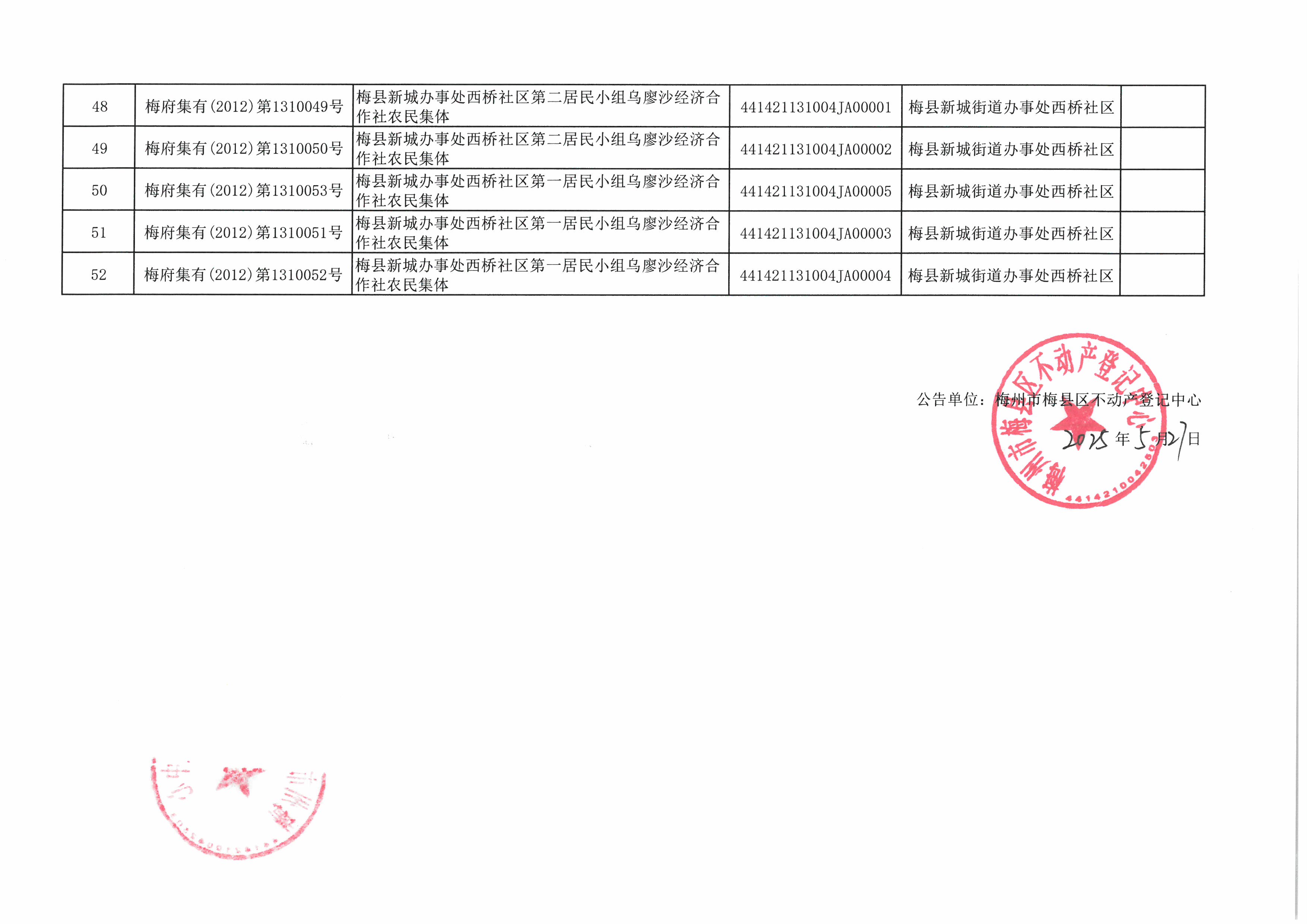 52 | 梅府集有(2012)第1310052号 | 梅县新城办事处西桥社区第一居民小组乌廖沙经济合作社农民集体 | 441421131004JA00004 | 梅县新城街道办事处西桥社区 |