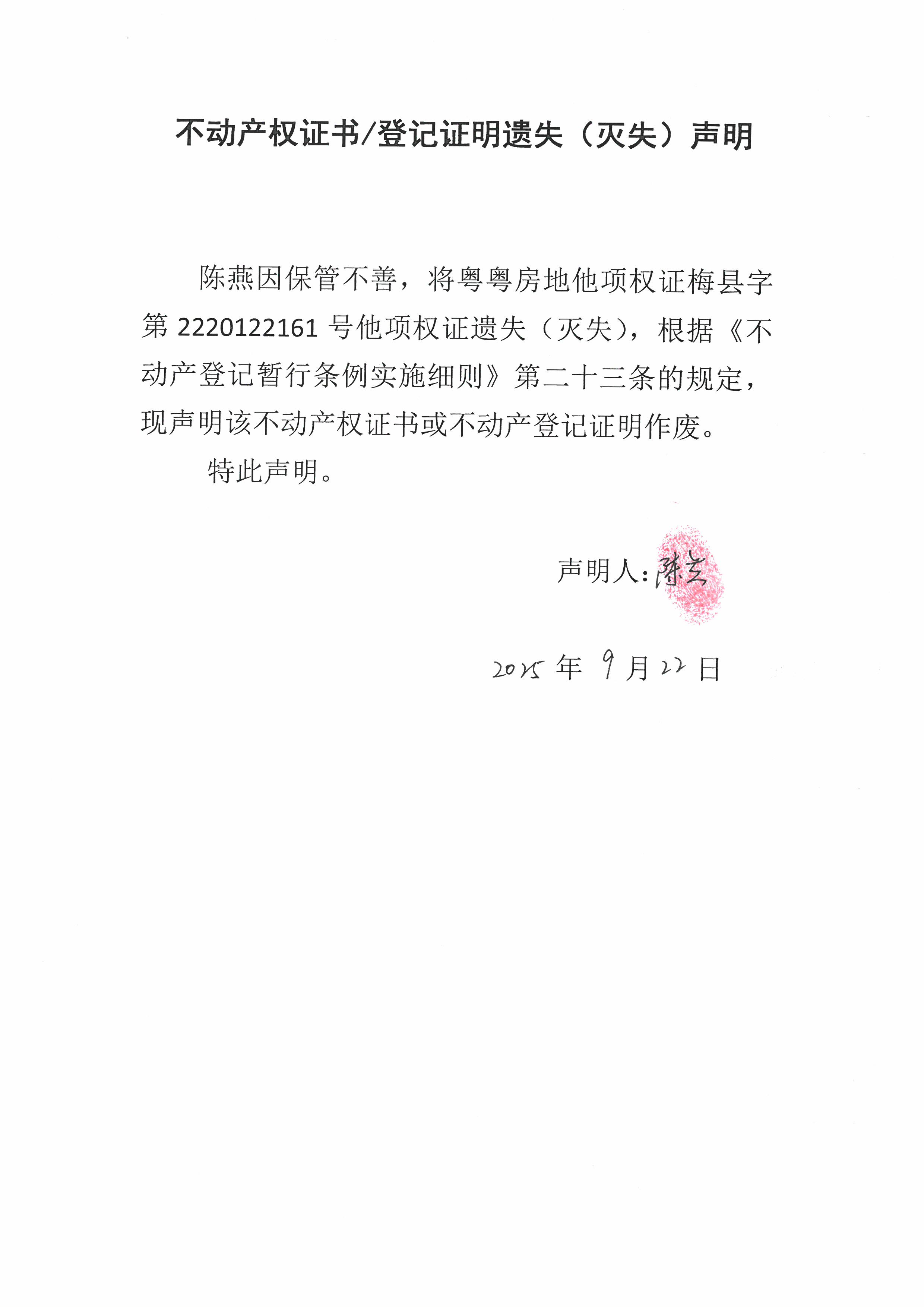 陈燕因保管不善,将粤房地他项权证梅县字第2220122161号他项权证遗失(灭失),根据《不动产登记暂行条例实施细则》第二十三条的规定,现声明该不动产权证书或不动产登记证明作废。