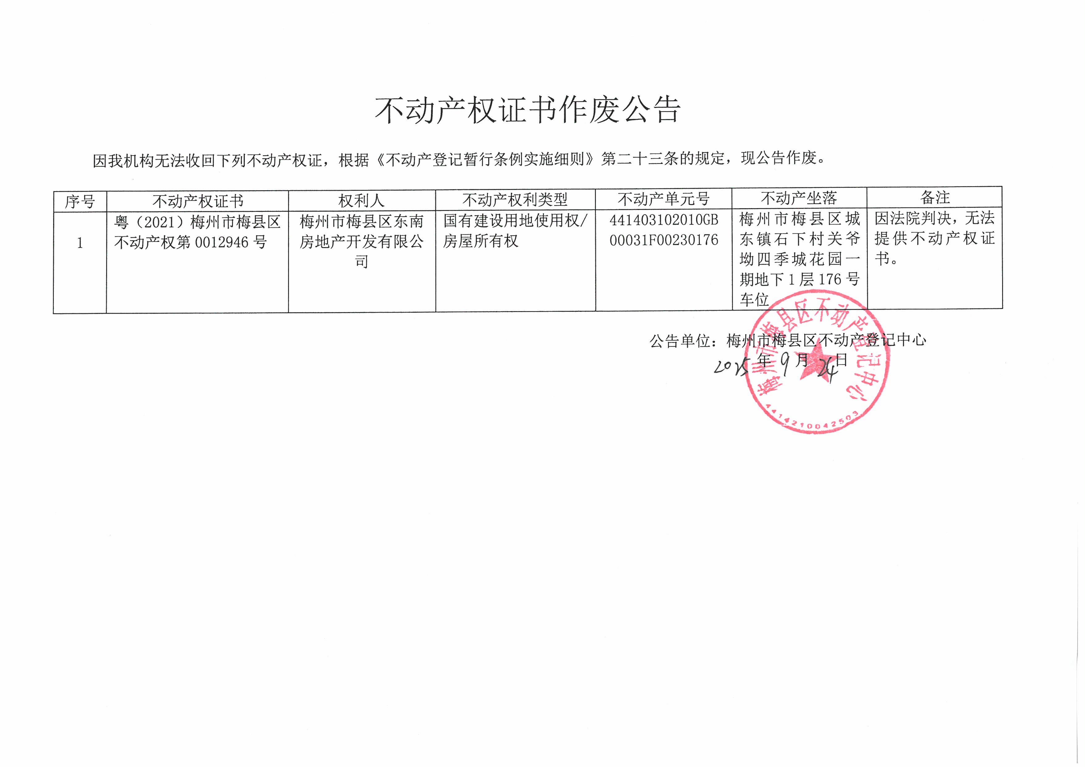 不动产登记中心登记公告(作废公告-梅州市梅县区东南房地产开发有限公司-粤(2021)梅州市梅县区不动产权第0012946号)