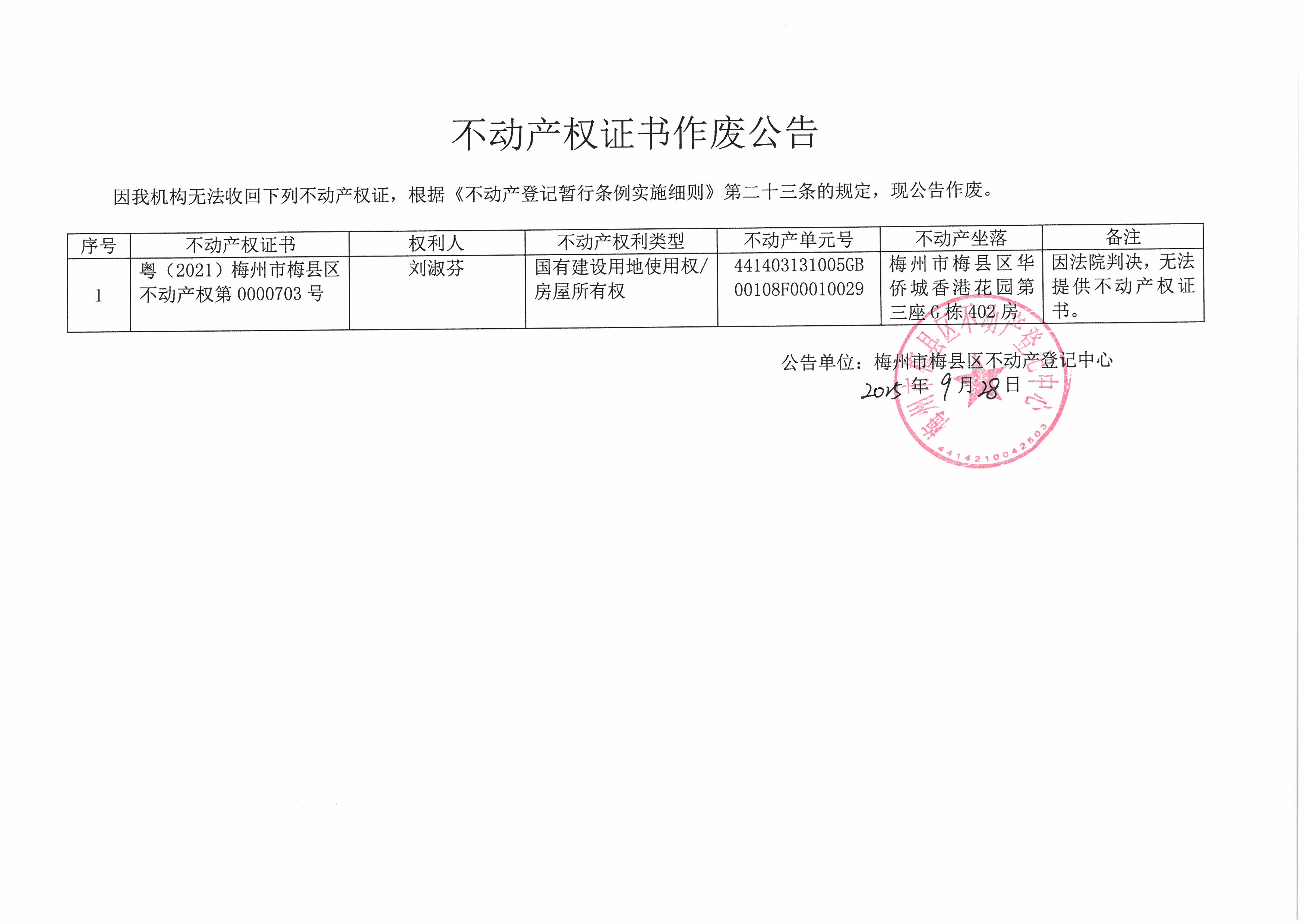 不动产登记中心登记公告(作废公告-刘淑芬-粤(2021)梅州市梅县区不动产权第0000703号)