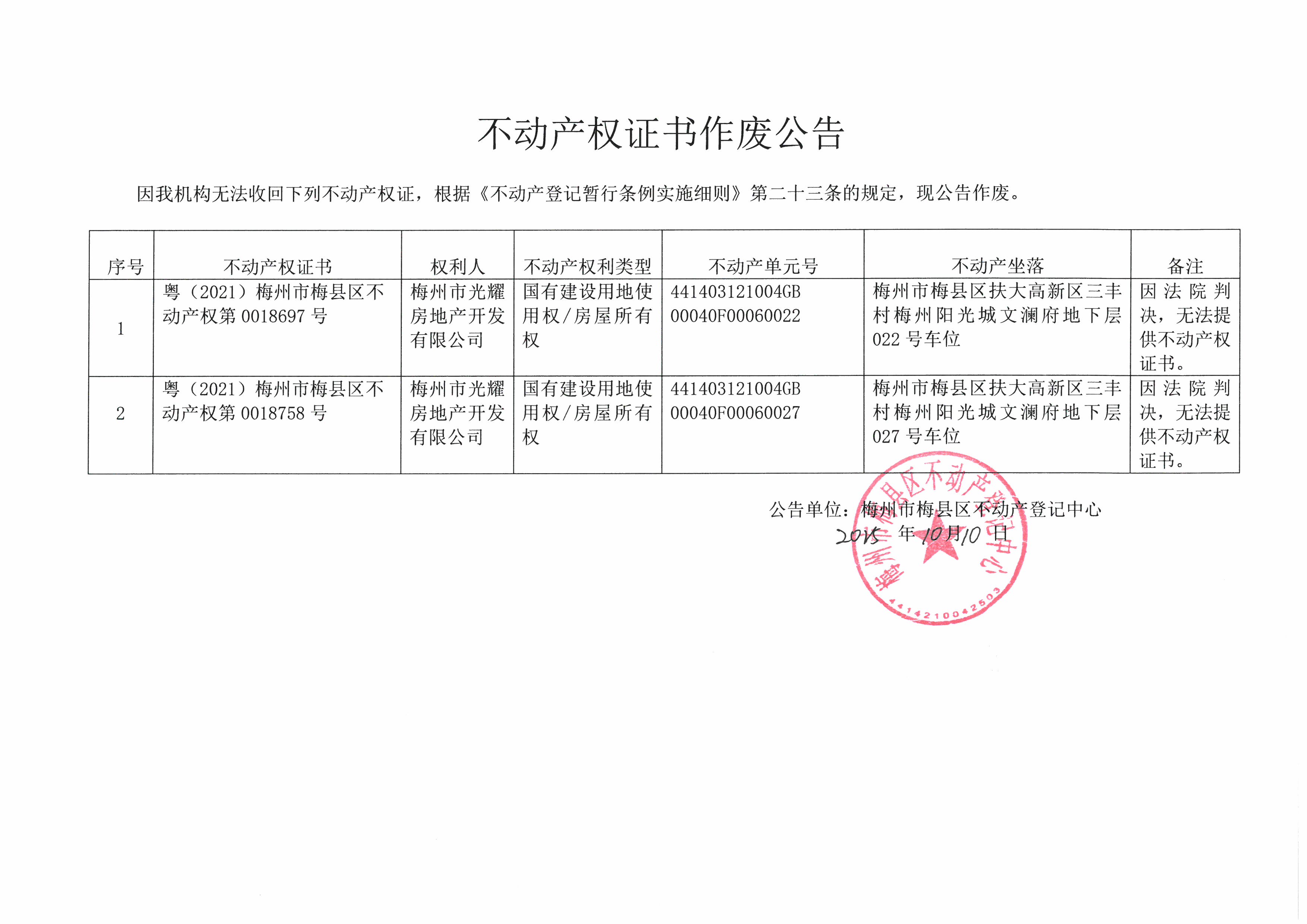 不动产登记中心登记公告(作废公告-梅州市光耀房地产开发有限公司-粤(2021)梅州市梅县区不动产权第0018697号-粤(2021)梅州市梅县区不动产权第0018758号)