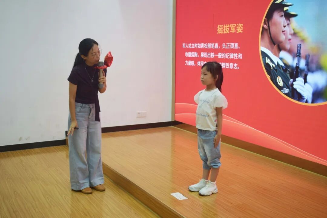绘本共读结束后,知识竞答与手势舞轮番上演,让爱国情感落地生;老师解读国庆节由来与阅兵式意义,邀请孩子上台示范挺拔军姿,放声歌唱《义勇军进行曲》,嘹亮歌声里满是崇敬。