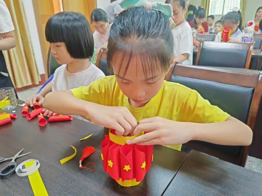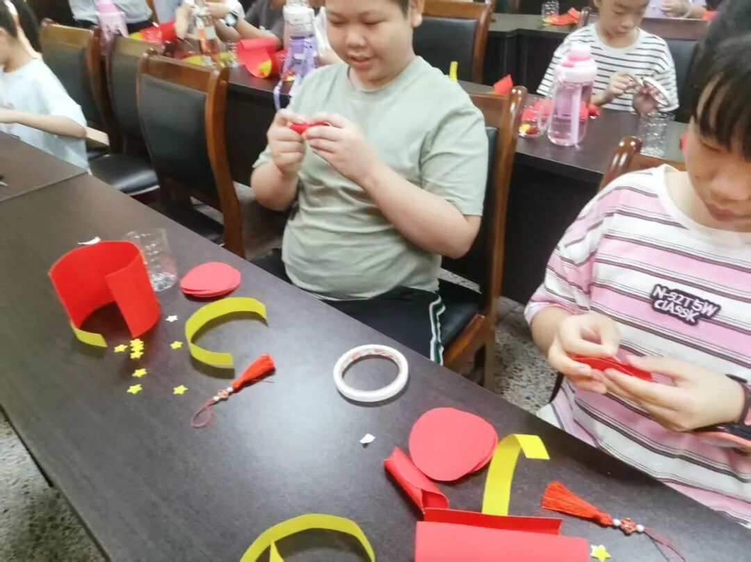 随后进入 “我爱中国红,制作节日灯笼” 环节。孩子们一双双小手灵活地忙碌着,折、叠、粘、贴,不一会儿,一个个色彩鲜艳、造型可爱的红色灯笼就制作完成了。