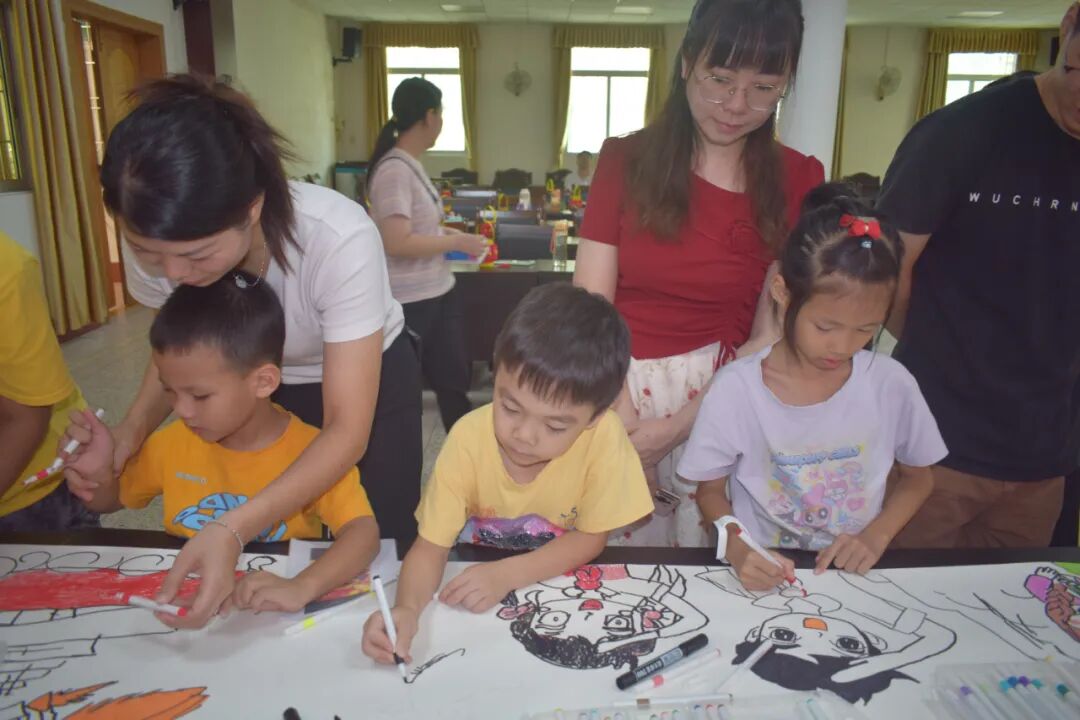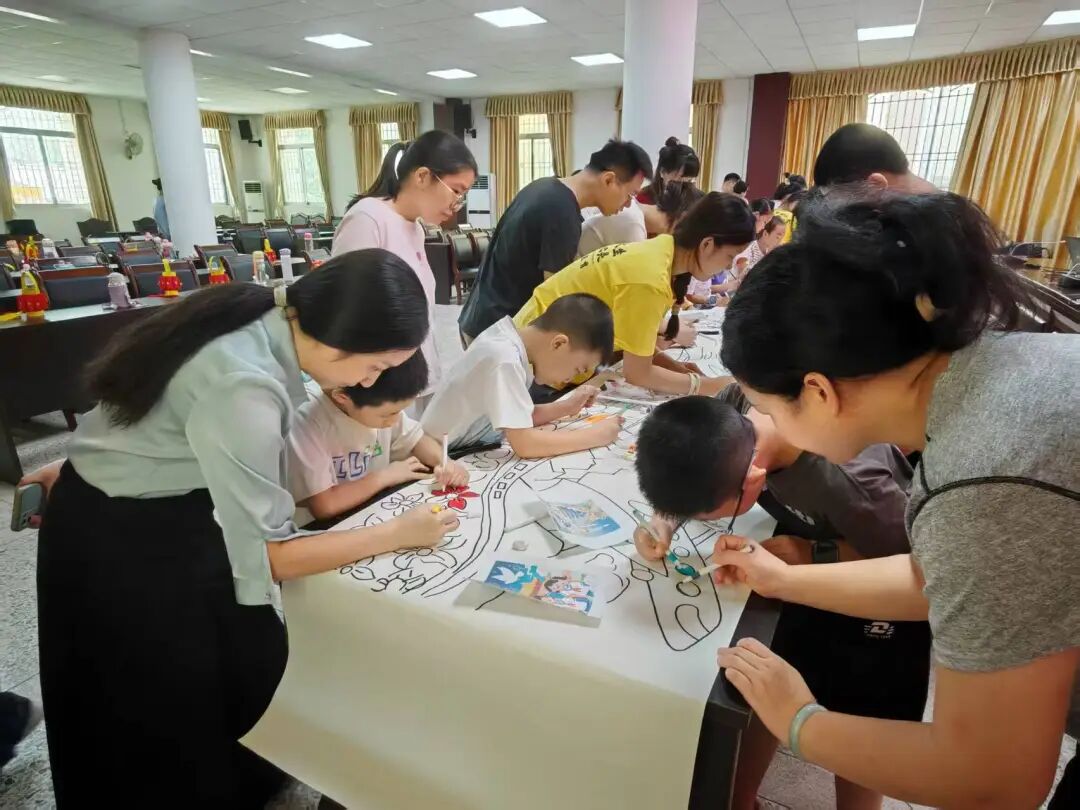 活动的压轴环节是 “手绘中华梦,我的祖国绘画长卷”。孩子与家长一同围在长卷旁,手持画笔尽情创作:有的专注勾勒亭台楼阁等传统建筑,有的认真画下象征和平的和平鸽,还有的在画卷上细致描绘出威严的龙与飘逸的祥云......大家分工协作、相互配合,完成了一幅色彩斑斓、充满童趣与爱国情怀的长卷。